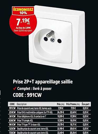 Découvrez une promotion exclusive sur la prise 2P+T apparaissant en saillie. Ce produit, non seulement fonctionnel, s'intègre facilement dans tous vos projets de bricolage. Que vous soyez un professionnel ou un bricoleur du dimanche, cette prise est un incontournable pour votre installation électrique.
