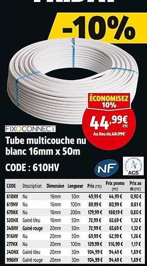 Le prix de ce tube multicouche est de 44,99 € TTC, au lieu de 49,99 €. Grâce à cette réduction de 10%, vous économisez 5 euros, ce qui en fait une offre très intéressante pour tous vos projets de plomberie.