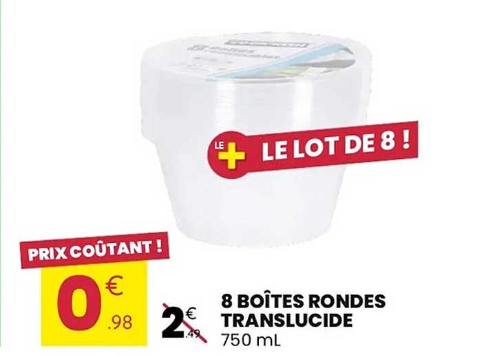 Découvrez un ensemble idéal pour votre cuisine ! Ce lot de 8 boîtes rondes translucides de 750 ml est parfait pour stocker tous vos ingrédients. Que ce soit pour des pâtes, des céréales ou des restes, ces boîtes répondent à tous vos besoins de conservation. Profitez de cette offre exceptionnelle valable du 15 au 21 septembre 2025 !