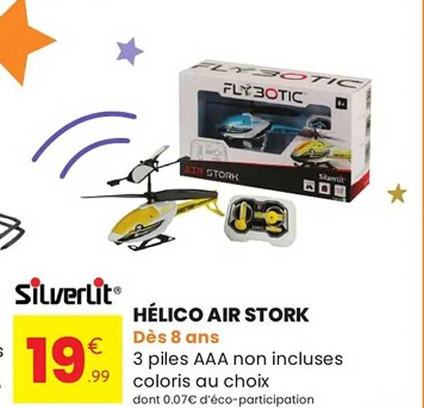 Découvrez l'Hélico Air Stork, un jouet télécommandé qui saura ravir petits et grands à partir de 8 ans ! Avec son design attrayant et ses couleurs vives, cet hélicoptère est parfait pour des heures de jeu en intérieur ou en extérieur. Ce modèle de Silverlit promet des vols fun et dynamiques, tout en offrant une grande maniabilité.