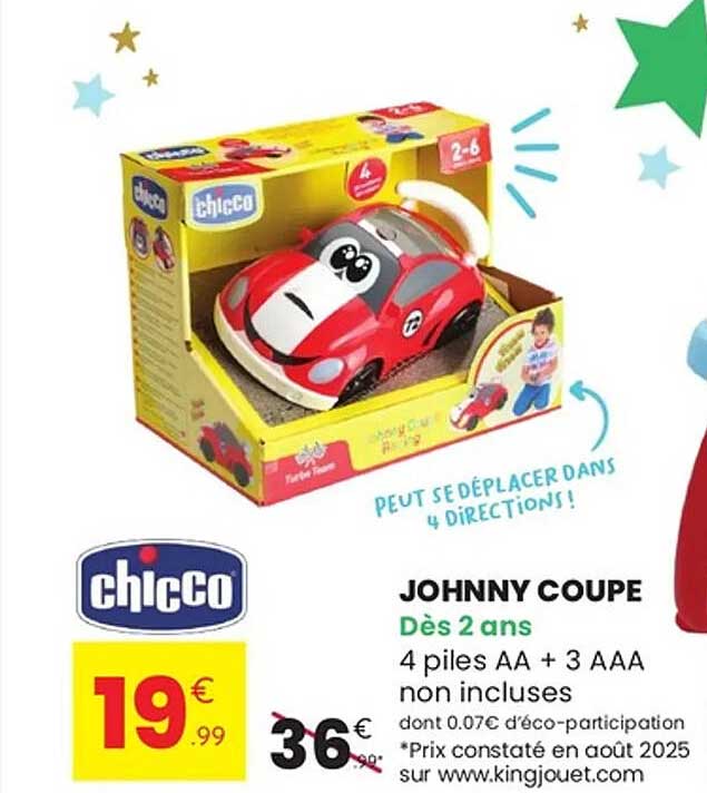 Préparez-vous à découvrir le JOHNNY COUPE, le jouet idéal pour les petits aventuriers ! Ce véhicule ludique de la marque Chicco est conçu pour les enfants dès 2 ans et promet des heures de joie et d'amusement. Grâce à son design attractif et à ses multiples fonctionnalités, il saura séduire les tout-petits. Cette offre exceptionnelle est valable jusqu'au 26 octobre 2025, alors n'attendez plus pour vous le procurer ici !