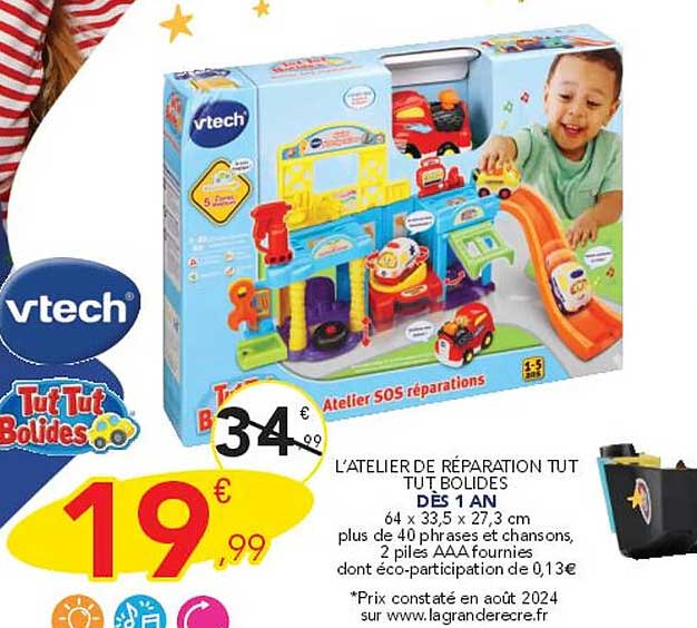 Vous voulez être informé immédiatement dès que le L'atelier De Réparation Tut Tut Bolides est en promotion? Inscrivez-vous à notre alerte d'offres. Vous recevrez une notification dès que le produit sera disponible à un prix avantageux.