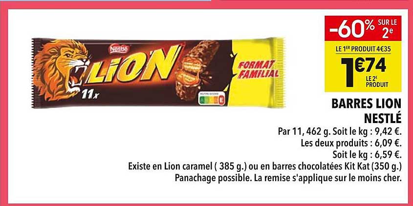 Plongez dans un océan de saveurs avec les Barres Lion de Nestlé, disponibles en promotion sur cette page. Que vous soyez en quête d'un encas rapide ou d'une gourmandise à savourer, ces barres allient croustillant et moelleux à la perfection. D'une taille familiale pratique, elles sont idéales pour partager ou pour se faire plaisir seul !