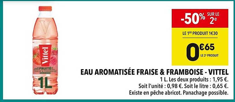 Découvrez l'eau aromatisée Vittel Fraise & Framboise, une boisson rafraîchissante parfaite pour les chaudes journées d'été. Actuellement en promotion, elle vous est proposée avec une incroyable réduction sur le deuxième produit. Une excellente occasion d'hydrater votre été avec saveur !