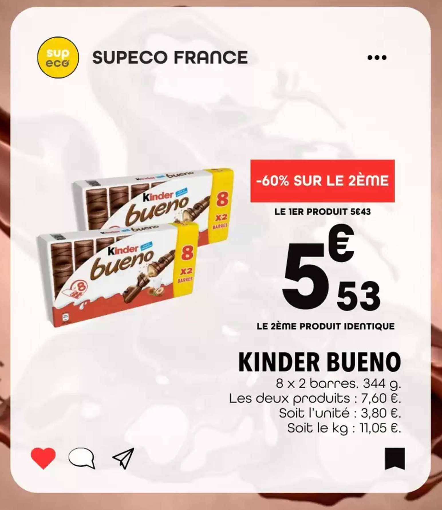 Découvrez l'offre de Kinder Bueno chez Supeco! Cette offre fantastique est maintenant disponible dans le nouveau catalogue de Supeco. Profitez de cette occasion et économisez considérablement sur votre achat.