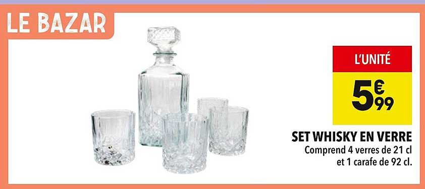 Proposé au prix exceptionnel de 5,99 €, ce set whisky est une occasion à ne pas manquer ! Comparé à d'autres services à whisky sur le marché, qui peuvent facilement atteindre le double de ce prix, cette offre vous permet de faire de belles économies tout en ajoutant une belle pièce à votre collection.
