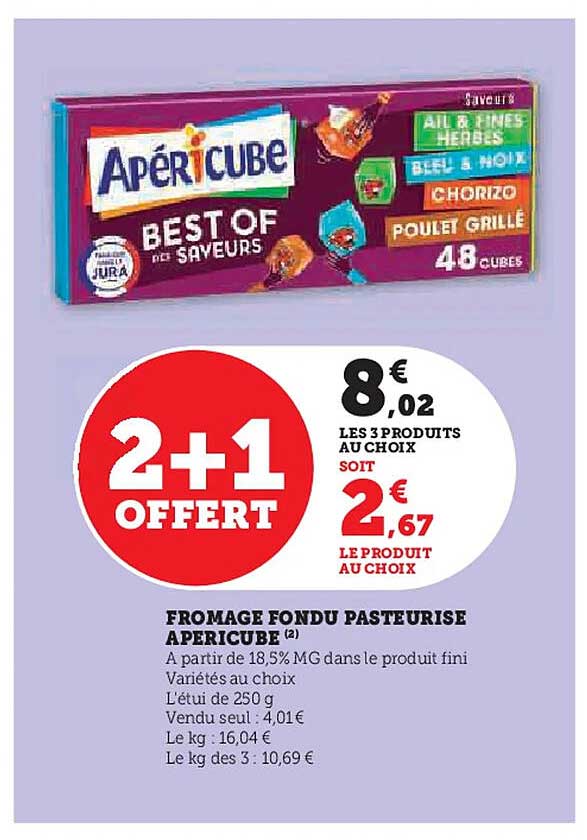 En quête d'un encas savoureux pour vos apéritifs ? Ne cherchez pas plus loin ! Cette offre exceptionnelle sur le fromage fondu pasteurisé Apéricube vous permettra de régaler vos convives sans vous ruiner. Profitez de trois produits au choix pour seulement 8,02 € grâce à l'offre 2+1 gratuit !
