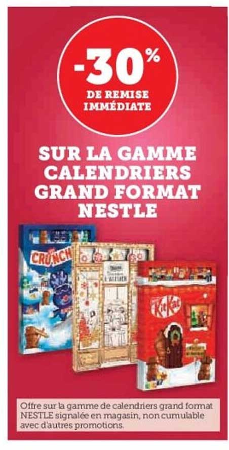 Les festivités de fin d'année approchent, et quoi de mieux pour patienter jusqu'à Noël que les célèbres calendriers de l'avent ? Avec une remise exceptionnelle de 30% sur la gamme des calendriers grand format Nestlé, c'est le moment idéal pour faire plaisir à vos proches tout en profitant d'économies intéressantes. Que ce soit pour les enfants ou les adultes, ces calendriers remplis de douceurs seront sans aucun doute un succès !