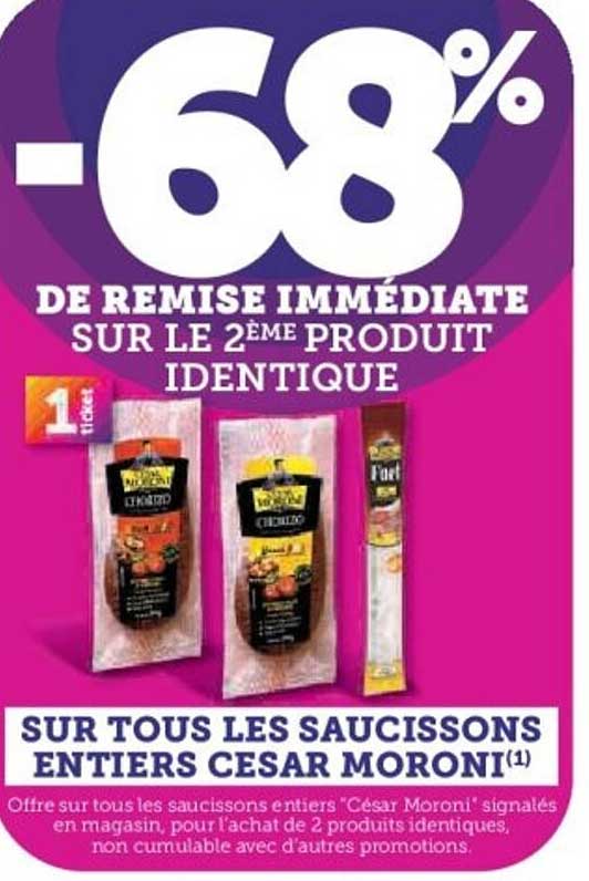 Découvrez une promotion incroyable sur les saucissons entiers de la marque César Moroni. Avec une remise immédiate de -68% sur le deuxième produit identique, c'est le moment idéal pour faire le plein de ces délicieuses charcuteries. Que ce soit pour un apéritif entre amis ou un repas en famille, ces saucissons sauront ravir vos papilles.