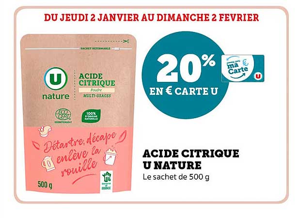 Découvrez l'offre de Acide Citrique U Nature chez Super U! Cette offre fantastique est maintenant disponible dans le nouveau catalogue de Super U. Profitez de cette occasion et économisez considérablement sur votre achat.