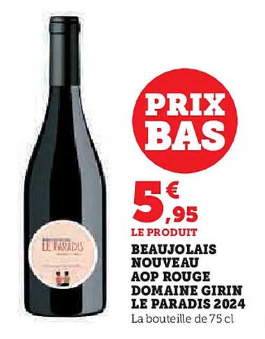 Découvrez l'offre de Beaujolais Nouveau Aop Rouge Domaine Girin Le Paradis 2024 chez Super U! Cette offre fantastique est maintenant disponible dans le nouveau catalogue de Super U. Profitez de cette occasion et économisez considérablement sur votre achat.