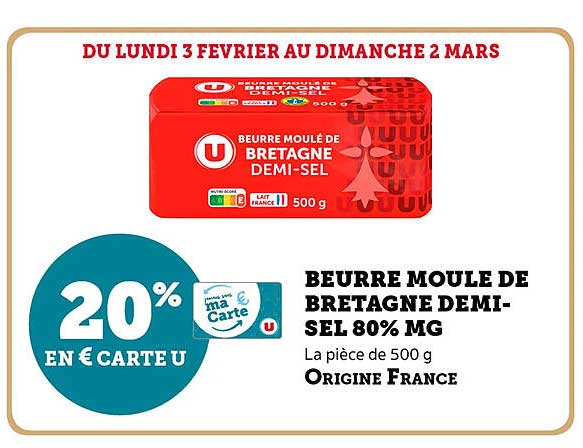 Découvrez dès maintenant la offre BEURRE MOULÉ DE BRETAGNE DEMI-SEL 80% MG dans le catalogue de Super U. Cette offre est valable du 03/02/2025 au 02/03/2025.