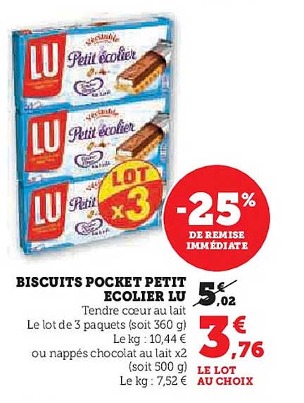 Découvrez les délicieux biscuits Pocket Petit Ecolier de LU en promotion ! Avec un tendre cœur au lait, ces biscuits sont parfaits pour toute la famille. Profitez d'une remise de 25% pendant une durée limitée, qui vous permet d'économiser tout en vous faisant plaisir. Que ce soit pour une pause gourmande, un goûter ou un dessert, ces biscuits sauront ravir vos papilles.