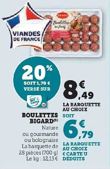 Profitez d'une réduction exceptionnelle sur les BOULETTES BIGARD, un incontournable pour vos repas en famille ou entre amis. Ces boulettes, issus de viandes de France, allient qualité et saveur. Que vous les choisissiez nature ou en version bolognaise, elles sauront ravir vos papilles. Cette offre est valable du 2 au 14 décembre 2025, alors ne manquez pas cette chance !