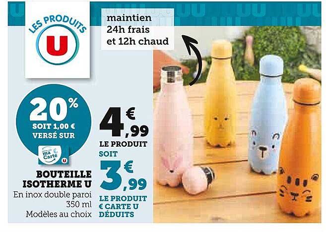 À l'origine, la bouteille isotherme était proposée au prix de 4,99 €. Actuellement, grâce à cette offre, vous pouvez l'acquérir pour seulement 3,99 €, ce qui représente une économie substantielle de 1,00 € avec la carte U. Ne ratez pas cette occasion unique !