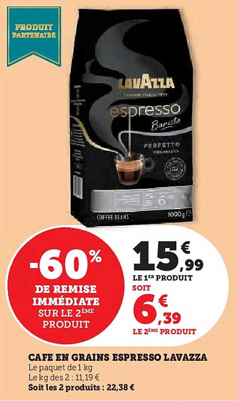 Découvrez la superbe offre de Cafe En Grains Espresso Lavazza dans le nouveau catalogue de Super U. En plus de cette offre, vous trouverez de nombreuses autres réductions attrayantes. Vous pouvez facilement commander le Cafe En Grains Espresso Lavazza en ligne via le site web de Super U ou l'acheter dans un magasin près de chez vous.
