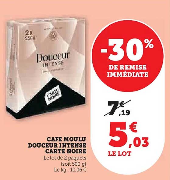 Découvrez le café moulu Douceur Intense de Carte Noire, une véritable invitation à savourer un moment de plaisir. Avec cette offre, vous bénéficiez d'une remise immédiate de 30%, rendant chaque tasse encore plus agréable à déguster. Pourquoi se priver d'un excellent café à un prix réduit ? Sur cette page, chaque amateur de café trouvera son bonheur.