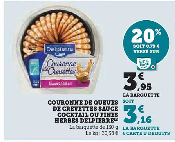 Découvrez l'offre de Couronne De Queues De Crevettes Sauce Cocktail Ou Fines Herbes Delpierre chez Super U! Cette offre fantastique est maintenant disponible dans le nouveau catalogue de Super U. Profitez de cette occasion et économisez considérablement sur votre achat.