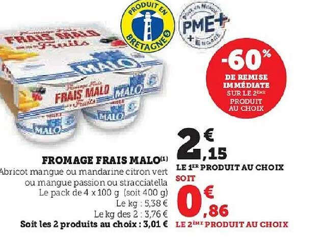 Actuellement proposé à 2,15 € pour le premier produit, le fromage frais Malo, qui a un prix habituel de 5,38 €, vous permet de réaliser des économies significatives. Avec l'offre sur le deuxième produit, vous obtenez ce délice à seulement 0,86 €, faisant ainsi de cette promotion une opportunité à ne pas manquer.
