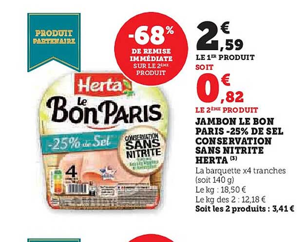 Offre de Jambon Le Bon Paris -25% De Sel Conservation Sans Nitrite Herta chez Super U