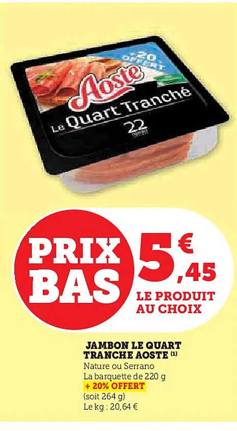 Découvrez l'offre de Jambon Le Quart Tranché Aoste chez Super U! Cette offre fantastique est maintenant disponible dans le nouveau catalogue de Super U. Profitez de cette occasion et économisez considérablement sur votre achat.