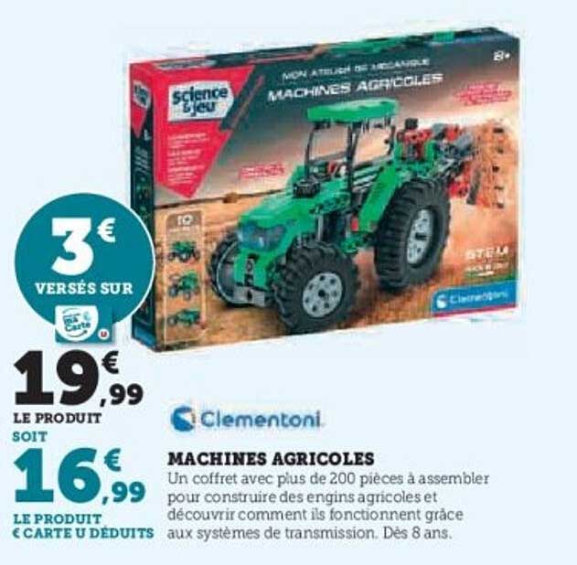 Découvrez notre incroyable promotion sur le coffret 'Machines Agricoles' de Clementoni, une idée cadeau parfaite pour les enfants à partir de 8 ans ! Ce kit passionnant, composé de plus de 200 pièces, permet de construire divers engins agricoles tout en apprenant le fonctionnement des systèmes de transmission. Une manière ludique d'éveiller la curiosité des jeunes scientifiques en herbe !