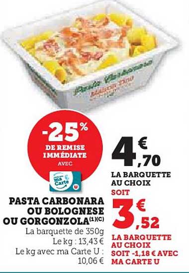 Offre de Pasta Carbonara Ou Bolognese Ou Gorgonzola chez Super U