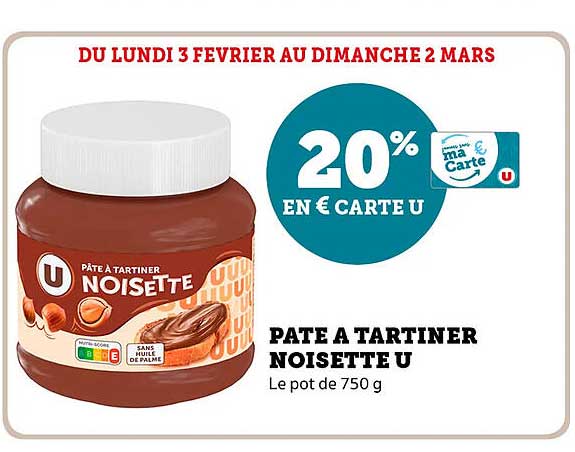 Découvrez dès maintenant la offre PATE A TARTINER NOISETTE U dans le catalogue de Super U. Cette offre est valable du 03/02/2025 au 02/03/2025.