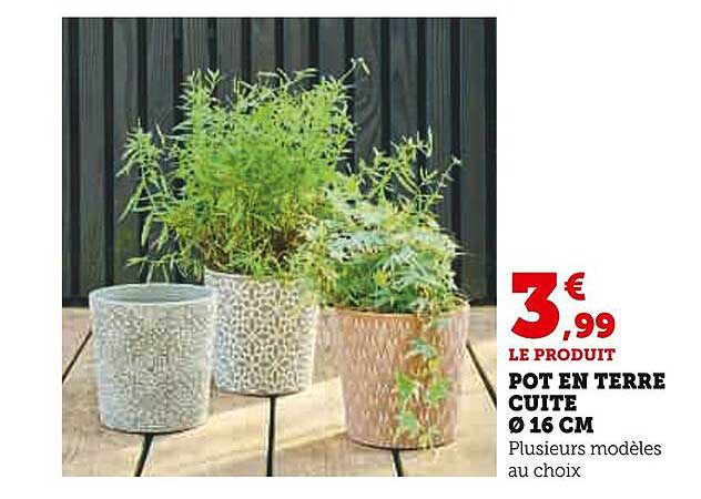 Découvrez dès maintenant la offre POT EN TERRE CUITE Ø 16 CM dans le catalogue de Super U. Cette offre est valable du 25/03/2025 au 21/04/2025.