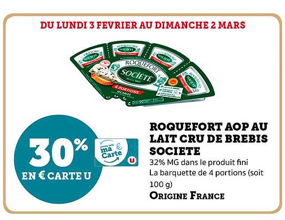 Découvrez dès maintenant la offre ROQUEFORT AOP AU LAIT CRU DE BREBIS SOCIETE dans le catalogue de Super U. Cette offre est valable du 03/02/2025 au 02/03/2025.