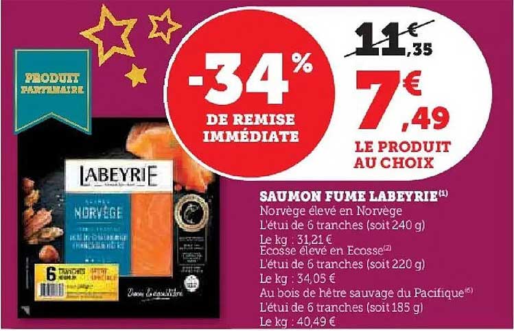 À l’origine, ce saumon fumé était proposé à 11,35 €, mais grâce à une remise immédiate de 34 %, vous pouvez vous le procurer pour seulement 7,49 €. C'est une véritable affaire, car vous économisez 3,86 € sur chaque emballage, ce qui le rend accessible à tous.