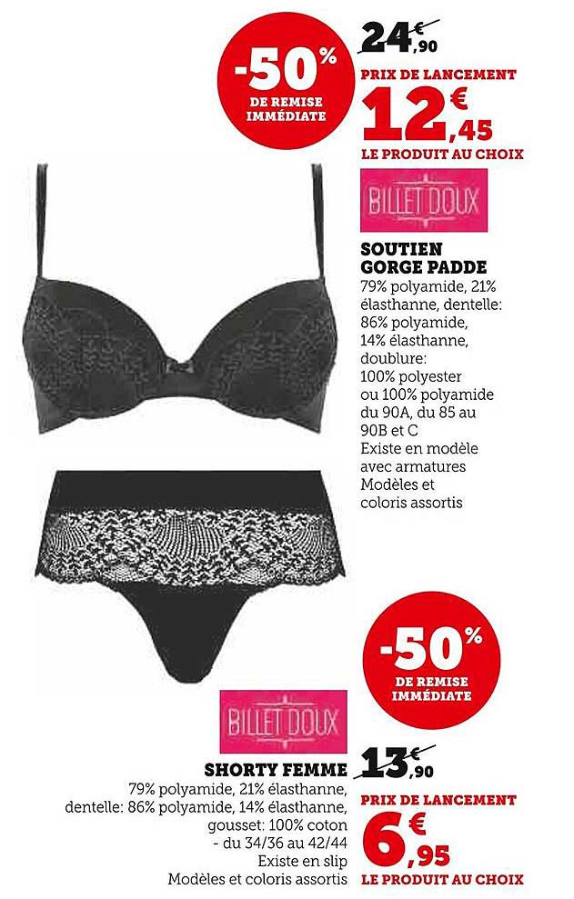 Découvrez une offre exceptionnelle sur le soutien-gorge Padde et le shorty Femme de la marque Billet Doux, disponibles à Super U. Ces articles ne sont pas seulement tendance, ils offrent également un excellent rapport qualité-prix. Profitez d'une remise immédiate de 50%, une occasion à ne pas rater pour renouveler votre lingerie tout en faisant des économies.
