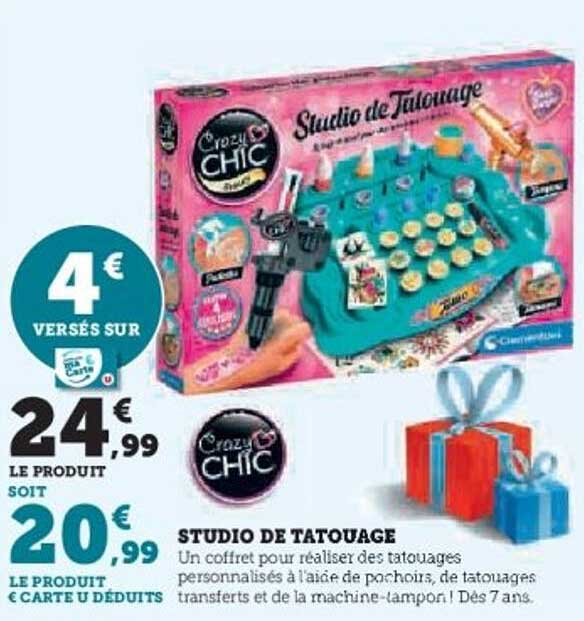 Vous cherchez une activité créative pour stimuler votre imagination ? Découvrez le Studio de Tatouage Crazy Chic ! Ce coffret est parfait pour réaliser des tatouages personnalisés grâce à des pochoirs, des transferts et une machine-tampon. C'est l'occasion idéale pour exprimer votre style et partager des moments amusants avec vos amis. Disponible jusqu'au 7 décembre 2025, cette offre vous attend sur cette page.