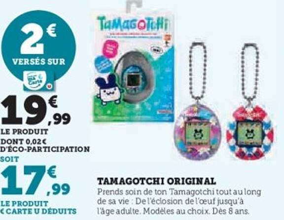 Découvrez l'incroyable promotion sur le Tamagotchi original, un compagnon virtuel qui a su captiver des générations entières. Pendant cette période, vous pouvez l'acquérir pour seulement 17,99 € au lieu de 19,99 €, soit une belle économie ! Prendre soin de son Tamagotchi, c'est comme avoir un petit animal de compagnie qui ne demande qu'à grandir et évoluer !
