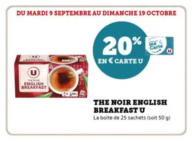 Découvrez une sélection raffinée de thé avec l’offre exceptionnelle sur le Noir English Breakfast U. Parfait pour commencer la journée avec énergie, ce thé noir de qualité vous promet un moment de dégustation unique. Profitez de 20% de réduction en carte U du 9 au 19 octobre et faites le plein de saveurs à petit prix !