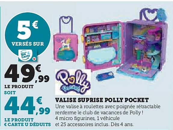 Découvrez l'offre de Valise Surprise Polly Pocket chez Super U! Cette offre fantastique est maintenant disponible dans le nouveau catalogue de Super U. Profitez de cette occasion et économisez considérablement sur votre achat.