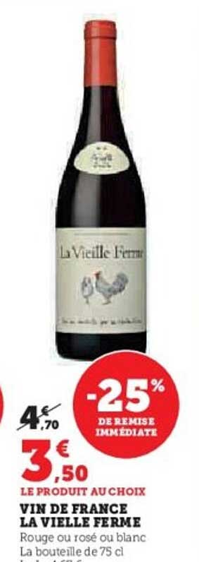 Découvrez une savoureuse offre sur le vin de France La Vieille Ferme, disponible en rouge, rosé ou blanc. Parfait pour accompagner vos repas ou simplement à déguster entre amis, ce vin de 75 cl est un excellent choix à saisir sur cette page.