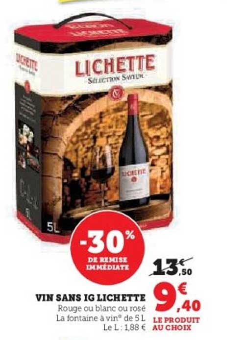 La promotion actuelle sur le vin sans IG Lichettte est une occasion à ne pas manquer ! Que vous soyez amateur de vin rouge, blanc ou rosé, cette fontaine de 5L saura ravir vos papilles tout en vous offrant un excellent rapport qualité-prix. Avec une remise de 30%, c'est le moment idéal pour compléter votre bar à vin.