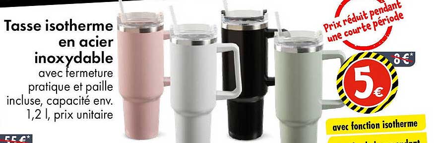 Profitez d'une promotion exceptionnelle sur la tasse isotherme en acier inoxydable ! Du 8 au 15 juin 2025, cette tasse pratique est au prix incroyable de 5 euros. Parfaite pour vos boissons chaudes ou froides, elle vous accompagnera partout, que ce soit au bureau, en déplacement ou lors de vos activités en plein air.