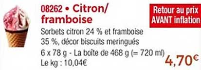 Découvrez une délicieuse combinaison de sorbets citron 24 % et framboise 35 %, agrémentée d'un décor de biscuits meringués. Cette offre est parfaite pour apporter une touche de fraîcheur à vos journées ensoleillées, tout en vous offrant une expérience gustative unique.