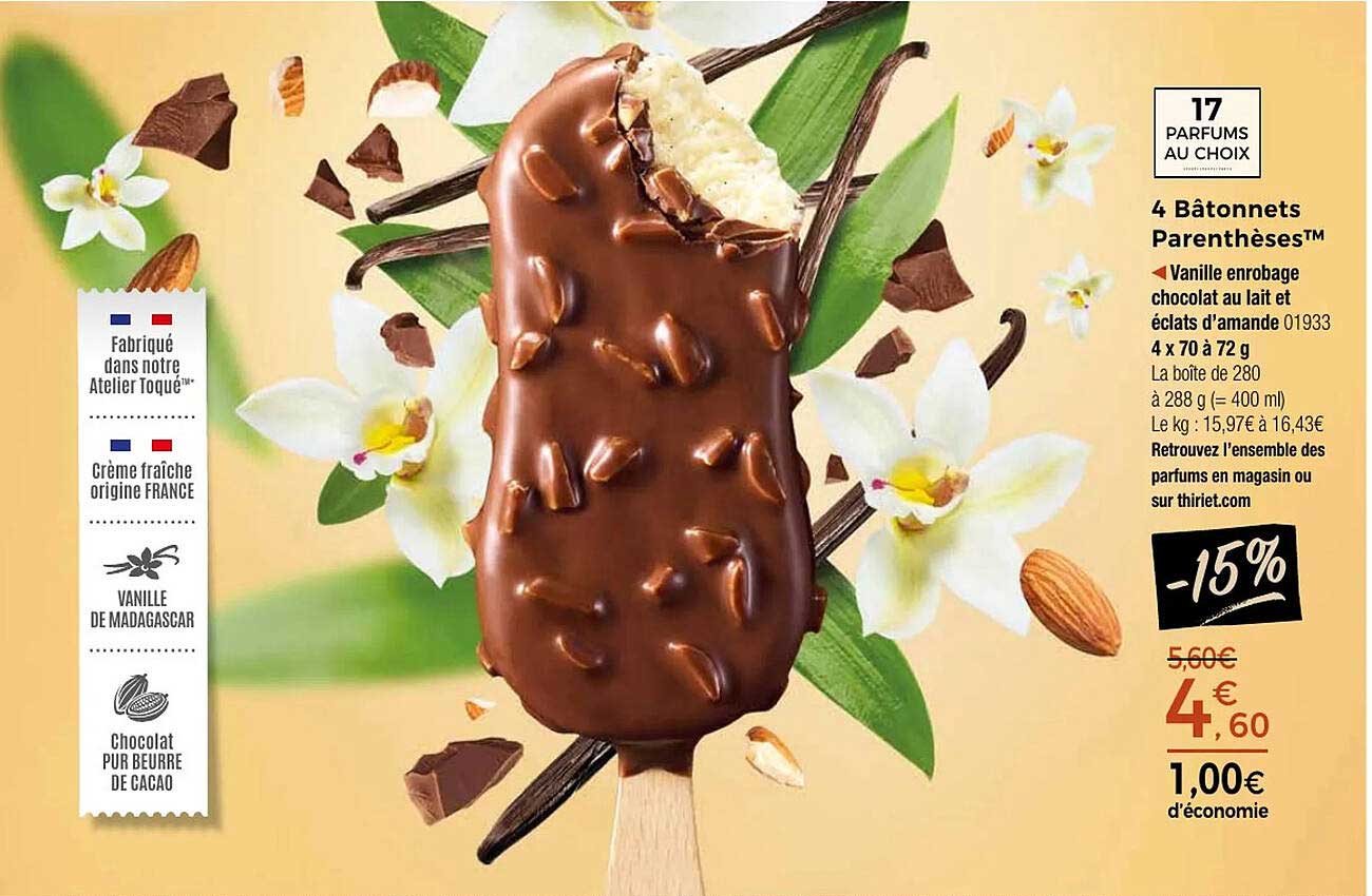 Profitez de cette délicieuse offre sur les Bâtonnets Parenthèses™ de Thiriet, parfaite pour les amateurs de douceurs glacées. Fabriqués avec de la crème fraîche d'origine France et de la vanille de Madagascar, ces bâtonnets promettent un voyage gustatif inoubliable. C'est l'occasion rêvée de vous faire plaisir tout en réalisant des économies.