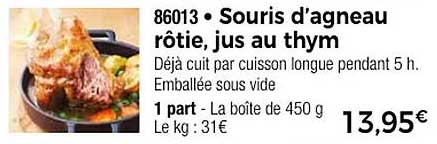 Découvrez dès maintenant la offre 86013 • Souris d'agneau rôtie, jus au thym dans le catalogue de Thiriet. Cette offre est valable du 20/03/2025 au 10/04/2025.