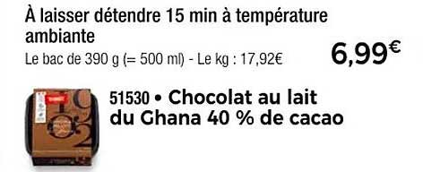 Le chocolat au lait du Ghana se présente dans un bac de 390 g, idéal pour le partager en famille ou entre amis. Ses ingrédients soigneusement sélectionnés garantissent une texture fondante et une saveur riche qui plaisent à tous. Pensez à le laisser détendre 15 minutes à température ambiante avant de le déguster pour en savourer pleinement toutes les nuances.