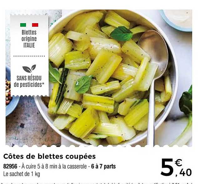 Les côtes de blettes coupées, originaire d'Italie, sont disponibles à un prix exceptionnel de 5,40 €. Cette offre, valable du 20 mars au 10 avril 2025, vous invite à découvrir le goût savoureux et la texture croquante de ces légumes. Parfaites pour accompagner vos plats, elles se cuisent rapidement, offrant une option saine et délicieuse pour votre repas.