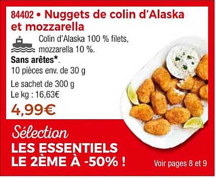 Vous cherchez un délicieu snack à déguster lors de vos dîners ou apéritifs ? Les nuggets de colin d'Alaska et mozzarella sont la solution parfaite ! Non seulement ils sont savoureux, mais ils sont aussi faciles à préparer. Profitez de cette offre exceptionnelle valable du 20 mars au 10 avril 2025 pour découvrir cette délicatesse dans votre assiette.