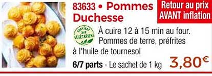 Les Pommes Duchesse sont idéales en accompagnement, notamment avec des viandes rôties ou des plats en sauce. Leur présentation en rosace et leur goût subtil les rendent idéales pour impressionner vos invités. De plus, elles sont pré-cuites, ce qui simplifie leur préparation.