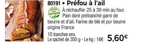 Découvrez le Préfou à l’ail, une véritable délicatesse qui égayera vos repas. Que ce soit en apéritif ou en accompagnement, ce pain doré prétranché, garni de beurre et d'ail, saura séduire vos papilles. Profitez de cette offre valable jusqu'au 10 avril 2025 et faites le plein de saveurs dans votre cuisine !