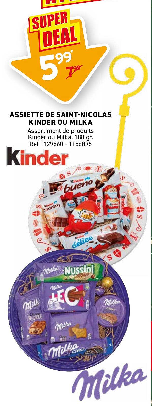 Découvrez une offre irrésistible sur l’Assiette de Saint-Nicolas, un assortiment délicieux de produits Kinder et Milka à partager ou à déguster seul. Profitez de cette promotion exclusive du 12 au 16 novembre 2025 pour faire plaisir à vos proches ou pour satisfaire votre petite envie de douceur. Chaque assiette, pesant 188 grammes, est un véritable trésor de chocolats qui mettra un sourire sur tous les visages!