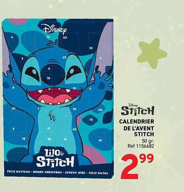 Préparez-vous pour la magie des Fêtes avec le superbe Calendrier de l'Avent Stitch ! Disposé pour émerveiller petits et grands, ce calendrier est idéal pour compter les jours jusqu'à Noël de manière ludique. Ce produit, à la fois amusant et festif, saura ravir les fans de Disney et particulièrement ceux du personnage emblématique Stitch.