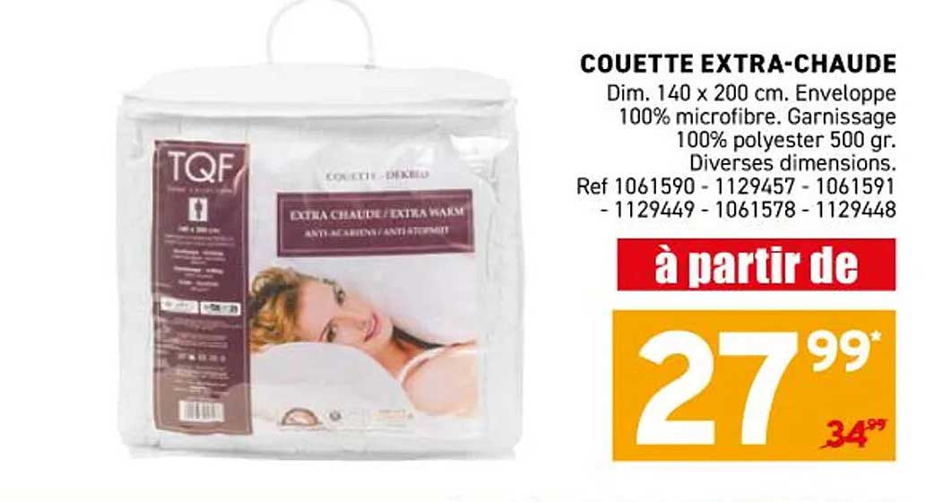 Proposée à partir de 27,99€, cette couette représente une économie considérable par rapport au prix habituel de 34,99€. Pour un produit de cette qualité, c'est une offre à sa justesse. Ne laissez pas passer cette chance de faire des économies tout en améliorant votre confort au quotidien.